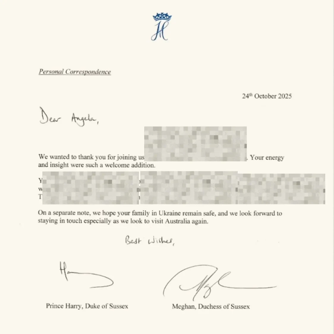 Фото Анжелы Перл"Мы хотели поблагодарить вас за участие в [мероприятии / встрече]. Ваша энергия и взгляд на вещи стали настоящим украшением вечера. [Пропущенные личные фразы]. Отдельно хотим отметить, что надеемся — ваша семья в Украине в безопасности. Будем рады поддерживать связь, особенно когда вновь соберёмся посетить Австралию", — говорится в письме.