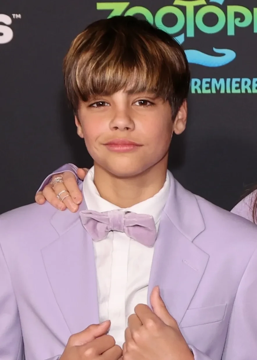 Певица вышла на красную дорожку в фиолетовом платье с разрезом и позировала вместе с детьми: 12-летним Миланом и 10-летним Сашей, которые были одеты в смокинги такого же цвета.