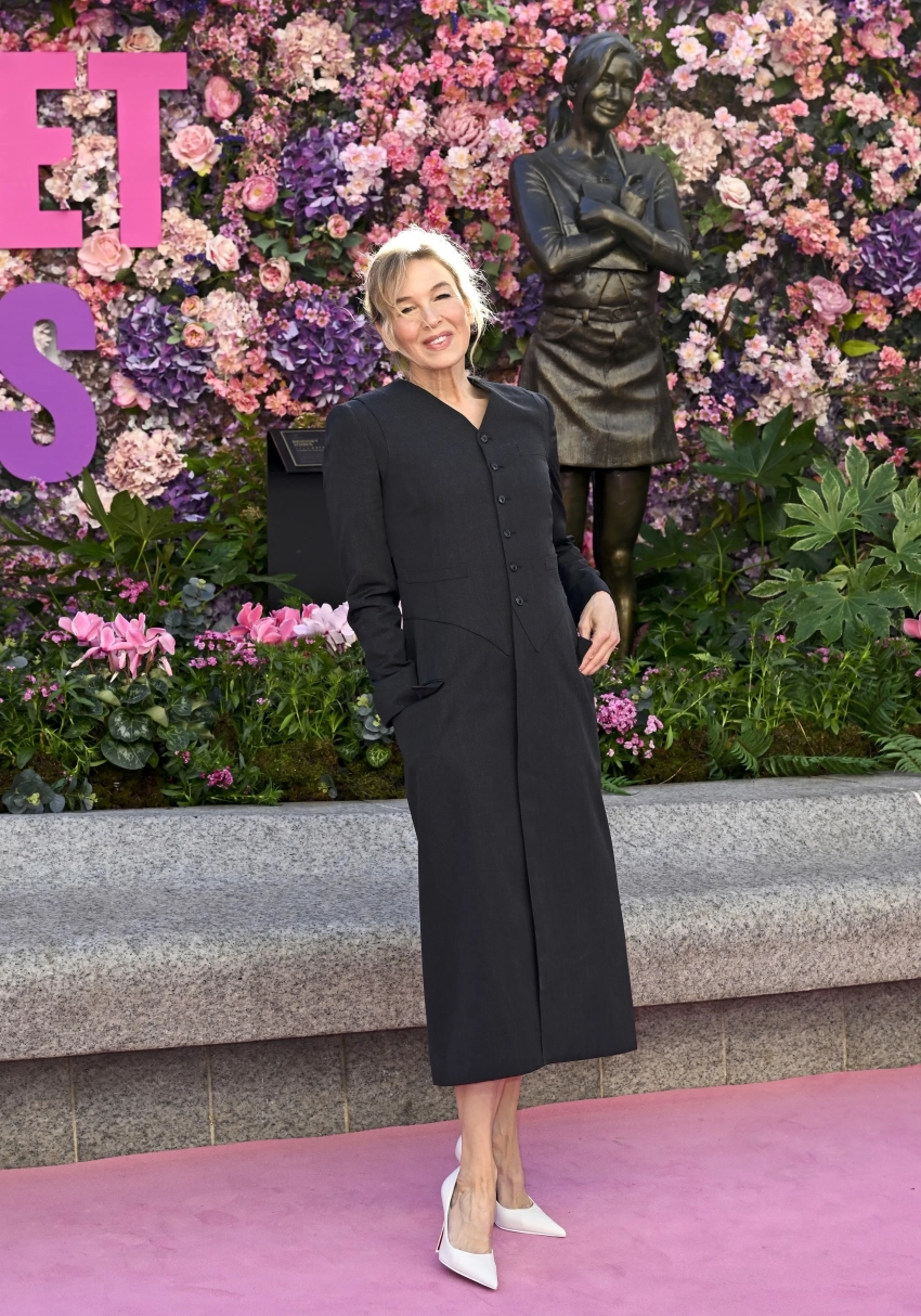 56-летняя Рене Зеллвегер позировала на фоне памятника в чёрном платье на пуговицах и белых туфлях на каблуках, а Хелен Филдинг пришла в кожаном пальто с мехом и сапогах.