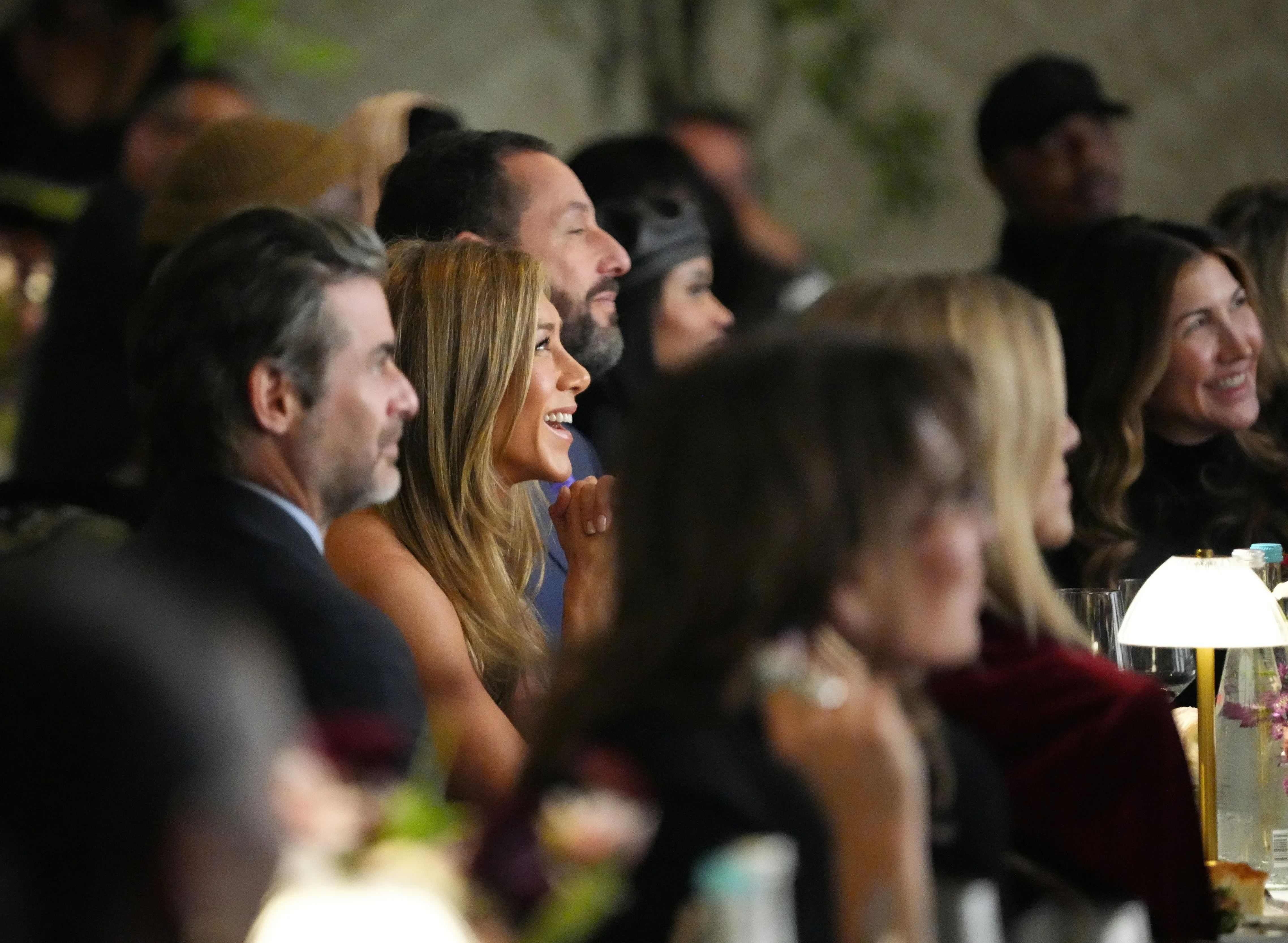 На дорожке Энистон позировала в одиночестве, а бойфренд присоединился к ней на светском вечере. Пара сидела за столом рядом с Адамом Сэндлером и его женой Джеки. Дженнифер стала лауреатом премии Women In Hollywood и вышла на сцену, чтобы произнести речь. Перед гостями актриса блистала в винтажном платье Ralph Lauren.