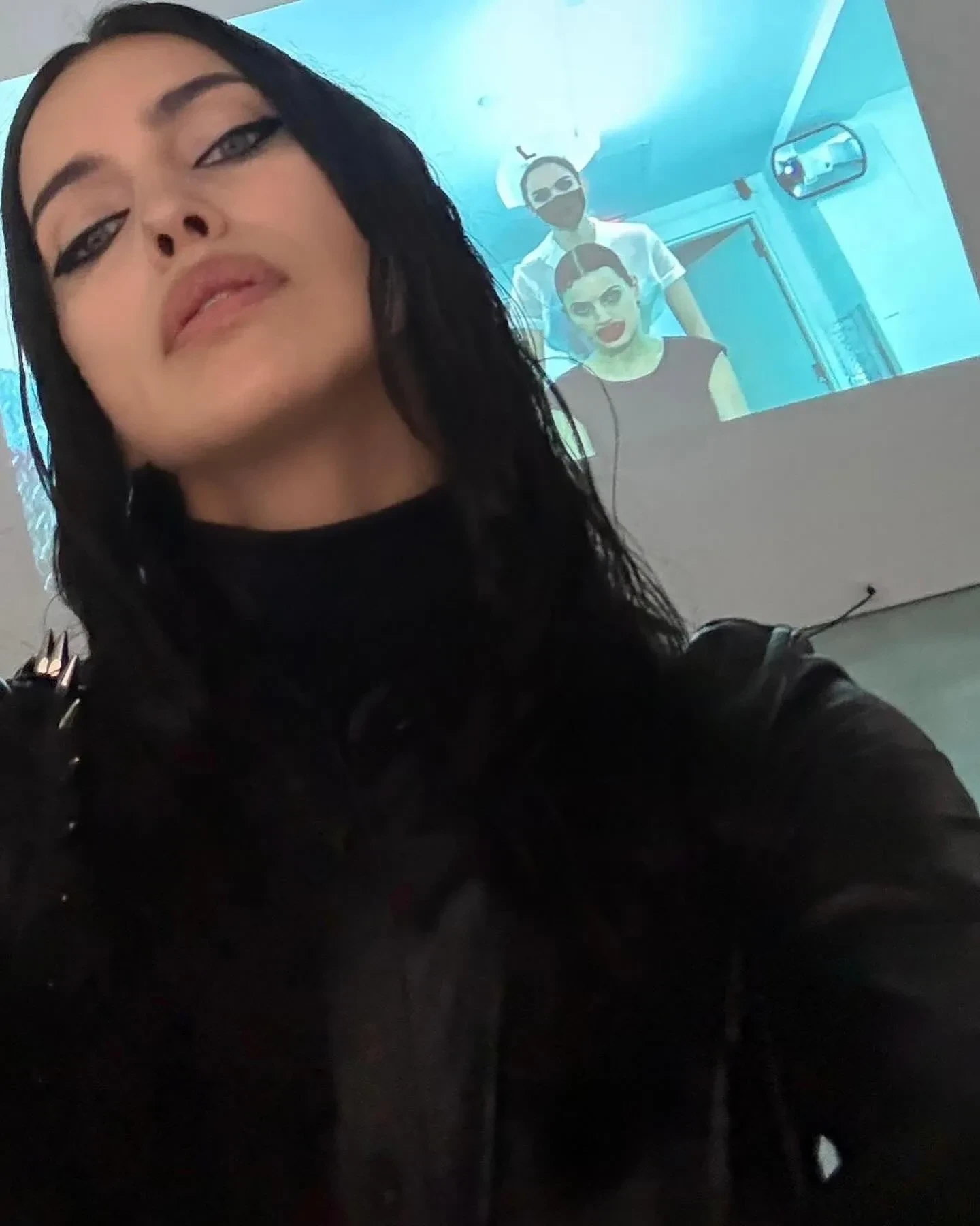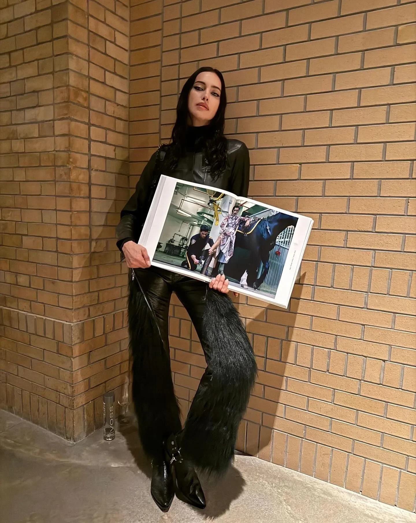 Для вечера Шейк выбрала образ total black: на ней была водолазка, кожаная рубашка и брюки с меховыми вставками. Образ модель завершила сумкой с шипами от Junya Watanabe x Inneraum, казаками и угольно-чёрными стрелками. "Вчера чествовали настоящего гения — Стивена Кляйна. Для меня огромная честь быть частью твоего мира и этого невероятного проекта. Столько любви, столько магии", — написала Ирина.