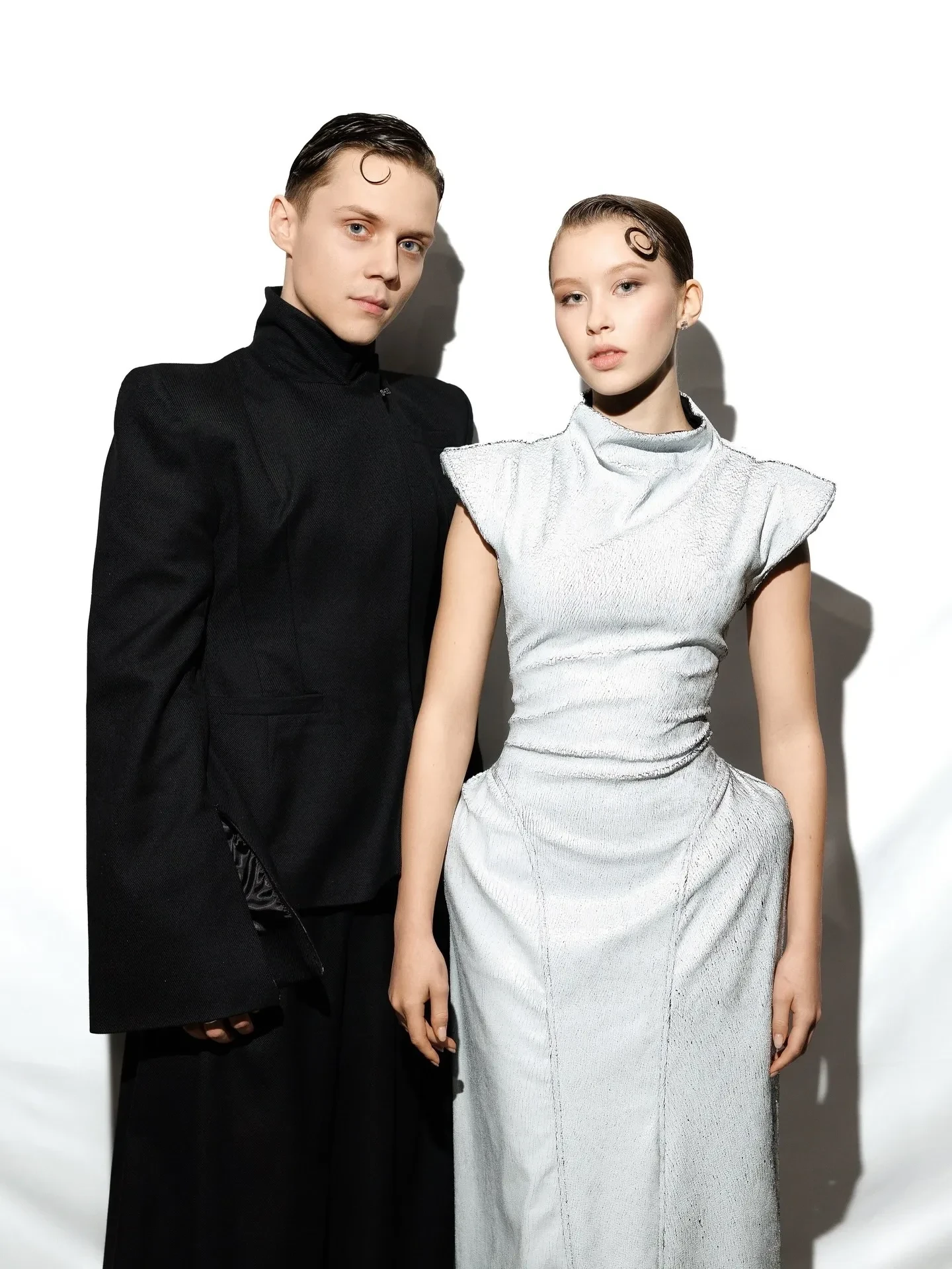 На фото, опубликованном в соцсетях марки, старшая дочь актрисы Юлии Пересильд и режиссёра Алексея Учителя позирует в белом футуристичном платье с подчёркнутыми плечами и бедрами, а её 20-летний бойфренд — в чёрном костюме в стиле джапанди. Завершает образ пары одинаковая "мокрая" укладка. Примечательно, что в этих же нарядах Анна и Ваня накануне появились в программе Павла Воли "Шоу Воли", где исполнили свою совместную песню "Силуэт" из фильма "Алиса в Стране чудес", в котором Анна сыграла главную роль.