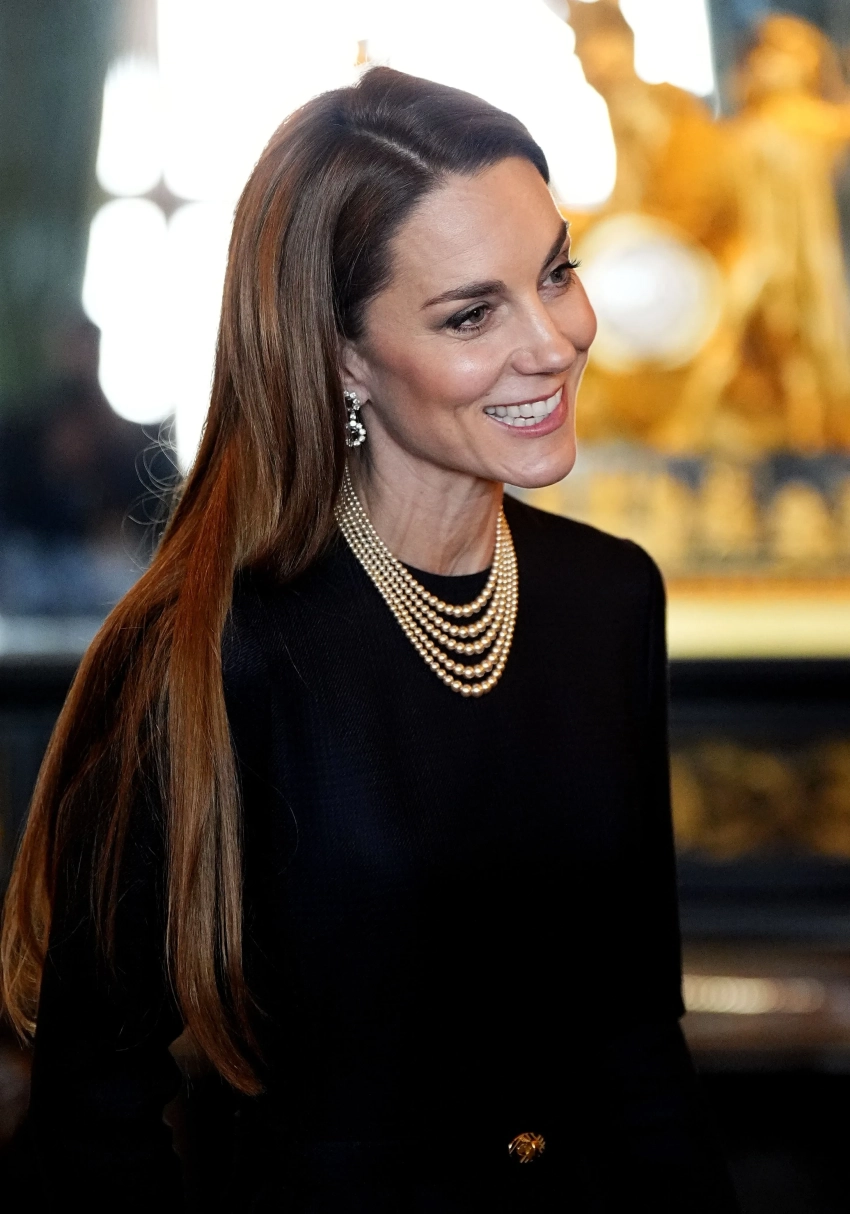 43-летняя принцесса Уэльская вместе с мужем рассматривали экспонаты из королевских коллекций, связанные с Германией. Для выхода в свет Кейт Миддлтон выбрала чёрное платье, дополнив образ жемчужным ожерельем и серьгами принцессы Дианы.