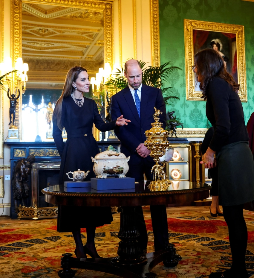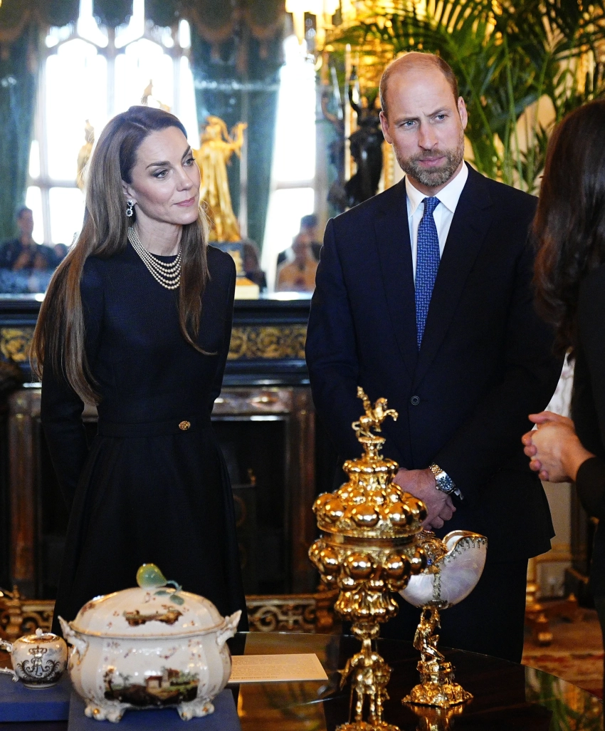 Принц Уильям и его супруга Кейт Миддлтон посетили выставку в зелёном салоне Виндзорского замка в ходе визита в Великобританию президента Германии Франка-Вальтера Штайнмайера и его супруги Эльке Бюденбендер.