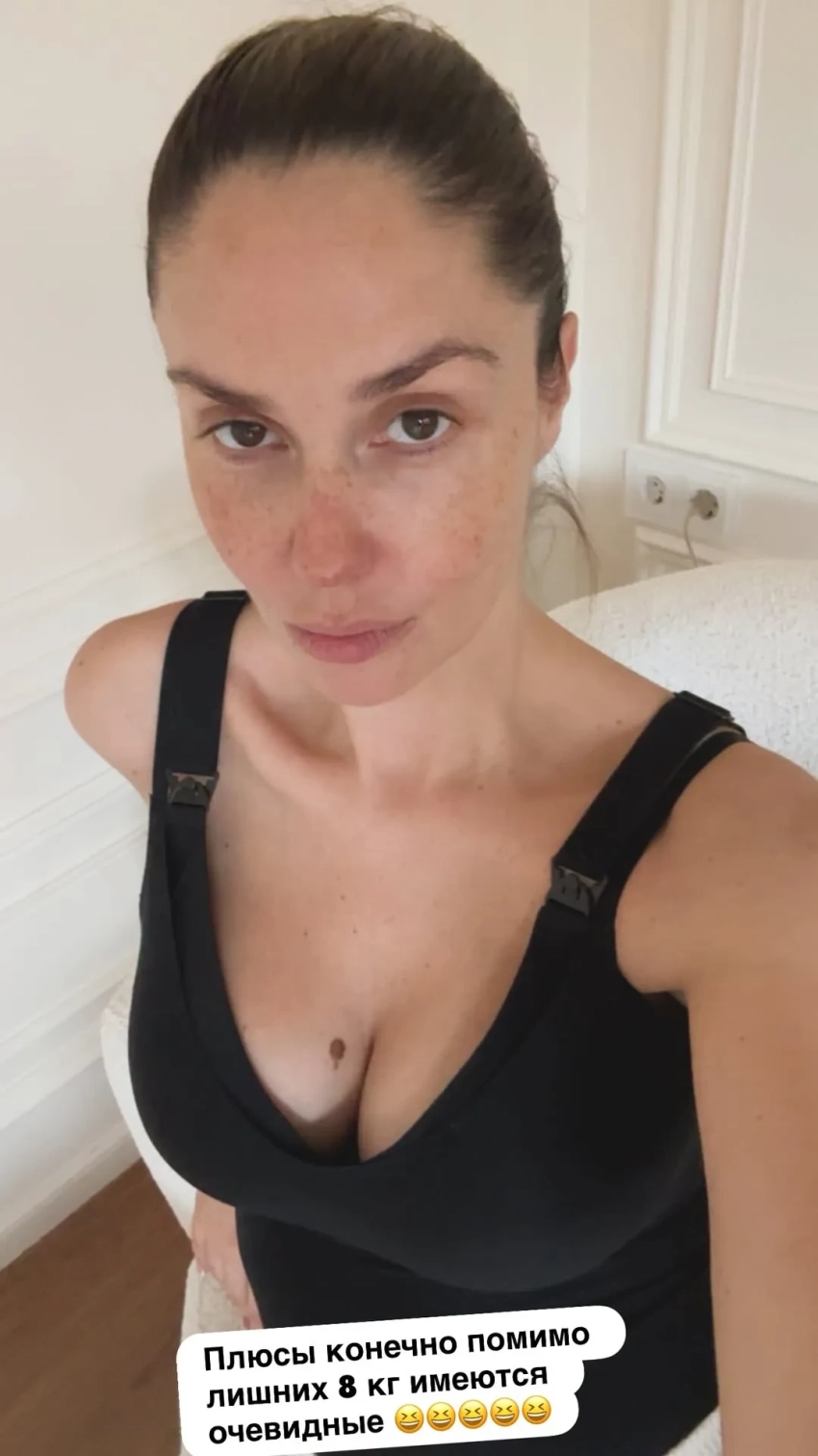 "Плюсы, конечно, помимо восьми лишних килограммов имеются очевидные", — отметила Муцениеце, по всей видимости, имея в виду увеличившуюся из-за лактации грудь.