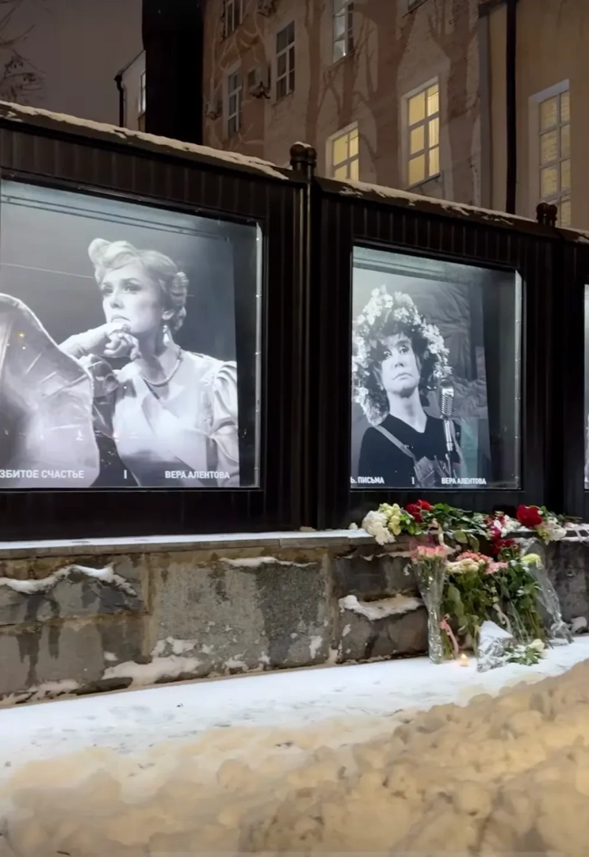 Последние дни поклонники несли цветы к портретам Веры Алентовой у Театра имени А. С. Пушкина, в котором она проработала около 60 лет.