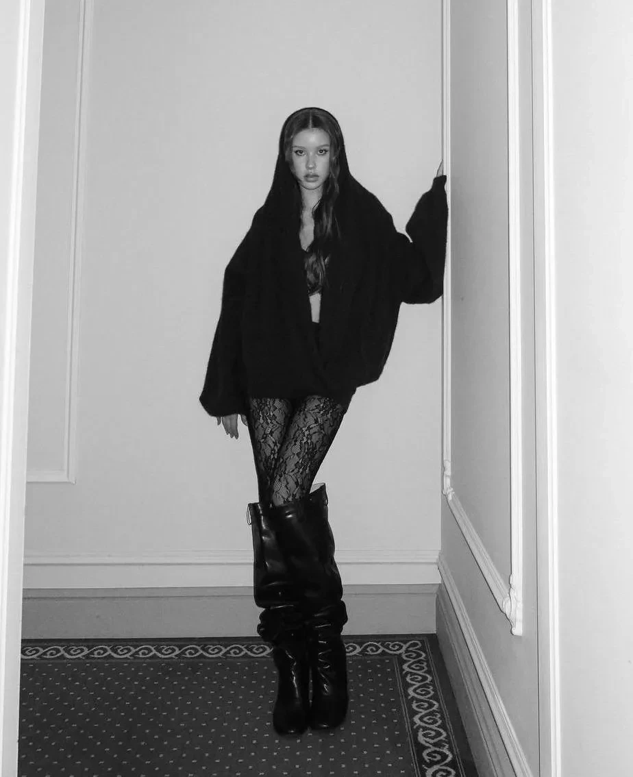 Пересильд снялась в закрытом сером платье с кожаными перчатками, а также в комплекте из вязаного лифа, джемпера и мини-шорт. Последний лук она дополнила кружевными колготками и ботфортами на каблуке.