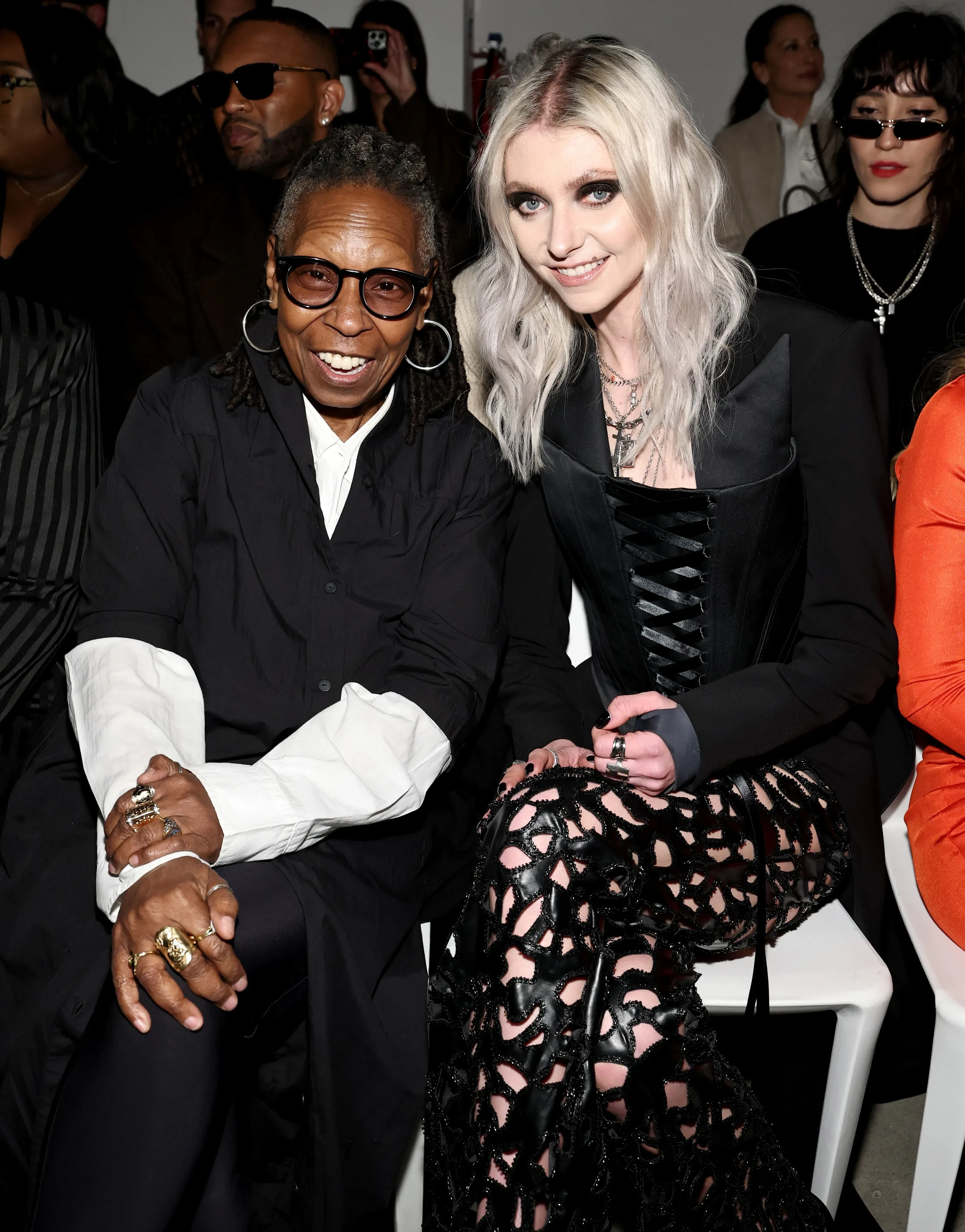 46-летняя Кейт Хадсон позировала в лиловом платье и шубе, а 35-летняя Тейяна Тейлор надела красное кутюрное платье Tamara Ralph. Любительница необычных образов Джулия Фокс пришла на показ в чёрно-белом костюме в полоску и горошек.