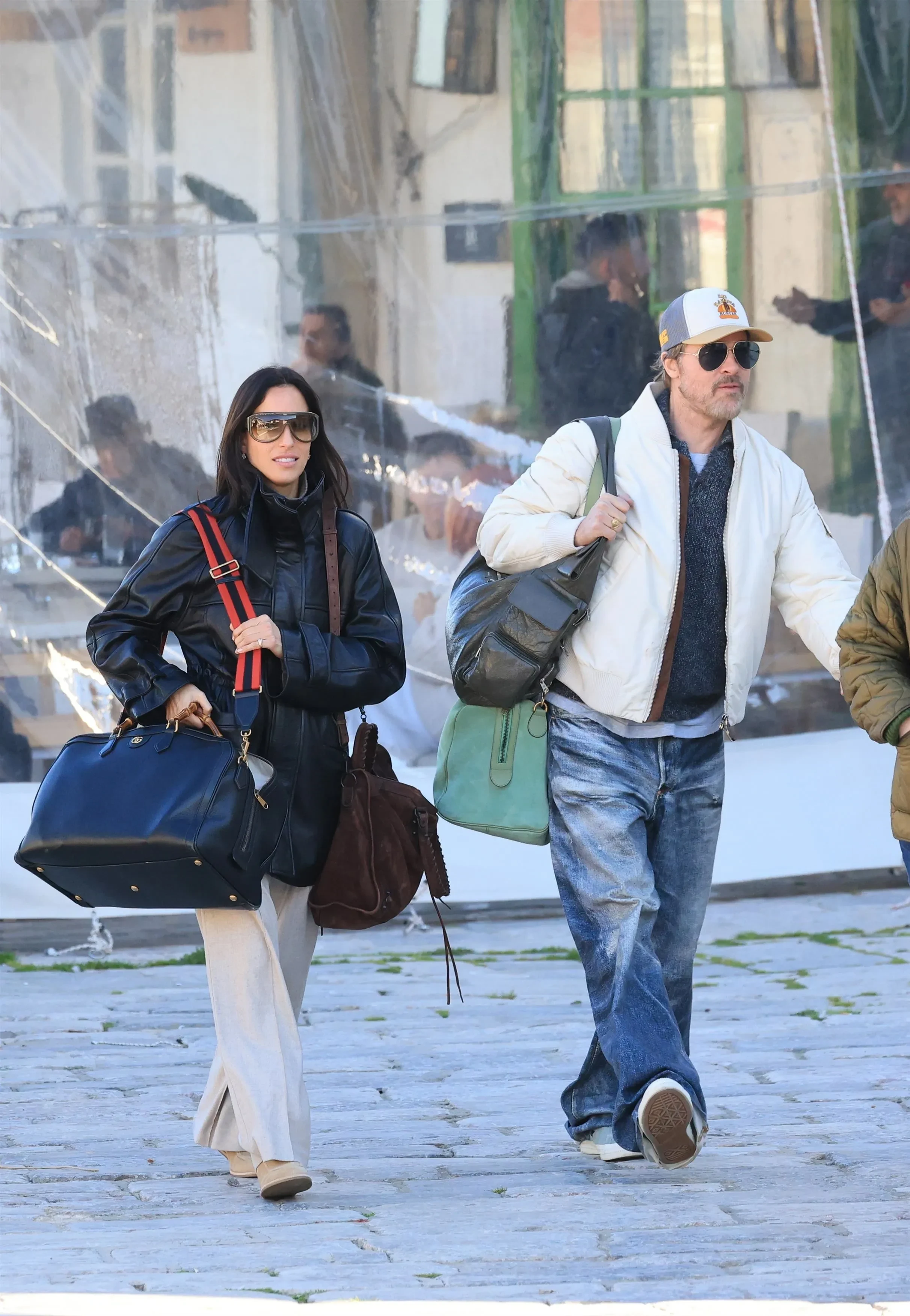 Для долгой дороги 62-летний Питт выбрал расслабленный образ: он был в белом бомбере, сером джемпере, джинсах оверсайз и бейсболке. 33-летняя де Рамон тоже предпочла повседневный стиль, надев чёрную кожаную куртку и бежевые брюки. В качестве аксессуаров они оба добавили солнцезащитные очки.