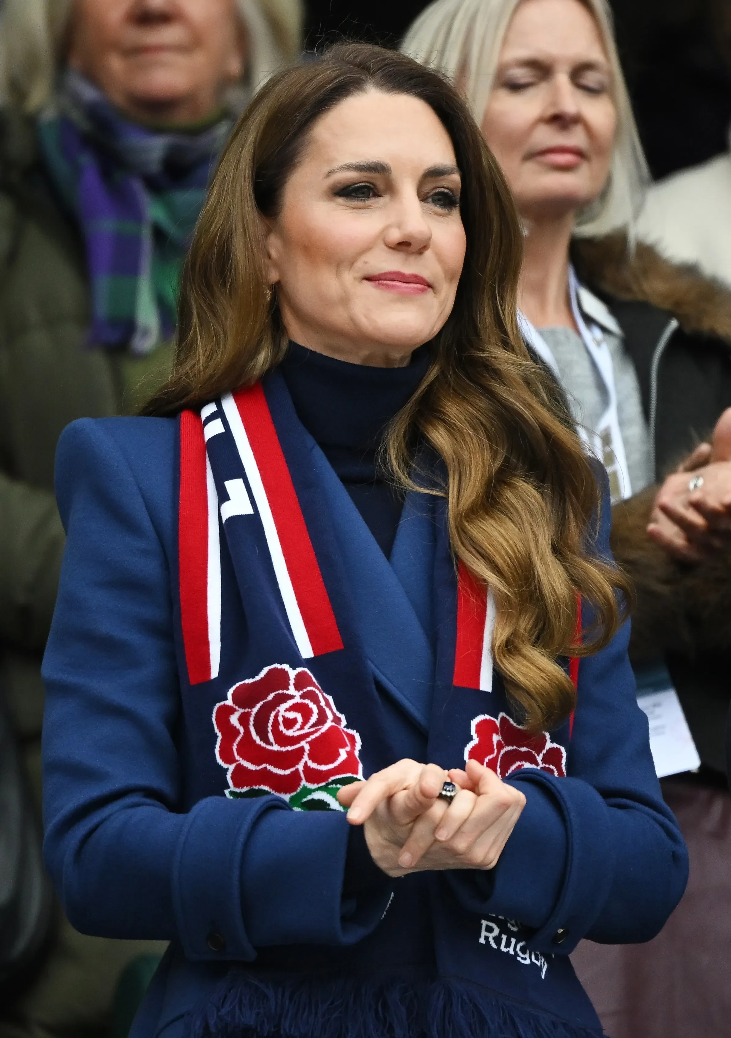 Принцесса Уэльская пришла на игру без мужа, принца Уильяма, и в своём любимом двубортном пальто синего цвета Alexander McQueen, которое она уже надевала не один раз. Кейт Миддлтон дополнила образ кожаными перчатками и шарфом с большими красными розами — логотипом английской команды.