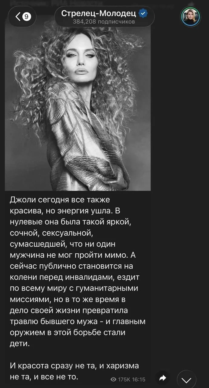 Вспомнили и неоднозначный пост Надежды, в котором та сетовала на то, что раньше Анджелина Джоли была такой "сочной и сексуальной, что ни один мужчина не мог мимо пройти", а сейчас "публично становится на колени перед инвалидами".