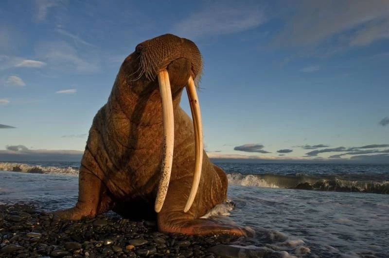 Интересно, что на теле моржа практически нет волос, но кое-где можно заметить редкие короткие щетинки. Однако, что привлекает наибольшее внимание, так это их мощные и длинные клыки. Эти зубы играют ключевую роль в жизни моржей: они помогают добывать пищу, выживать в борьбе за место на суше и служат эффективным оружием в схватках с конкурентами. Основной рацион моржей составляют моллюски и ракообразные, тогда как рыба не является частью их диеты.