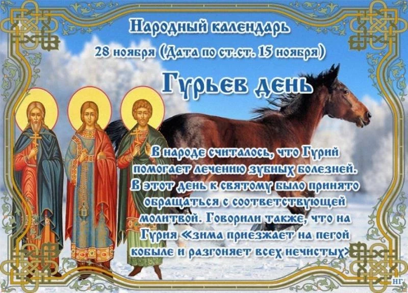 28 ноября — день, когда в русских традициях особенно чтят святого Гурия, который, по народным поверьям, защищает семьи и женщин от обид своих супругов. Этот день сопровождался множеством интересных примет и обычаев, среди которых особое место занимали лошади, а также важное значение имели пост и молитвы.