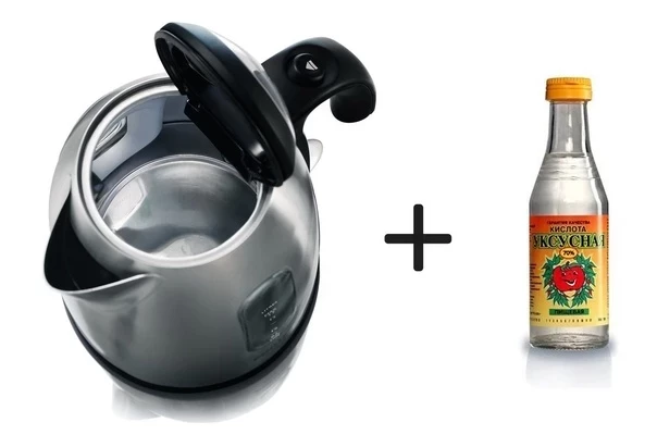 Смешайте воду с уксусом в пропорции 1:1 и залейте в чайник, заполнив его наполовину.