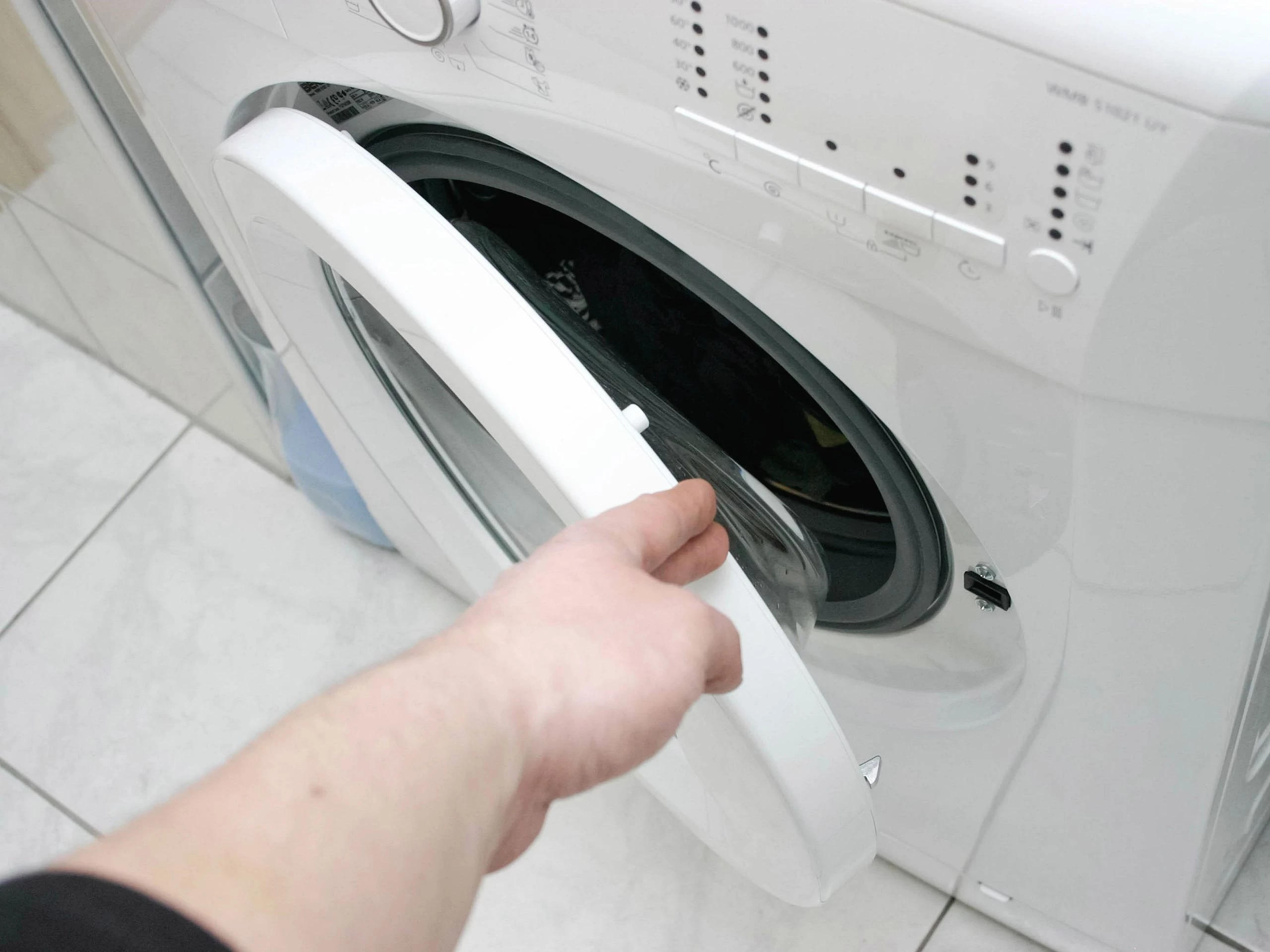 • После окончания стирки достаньте бельё и откройте дверцу.