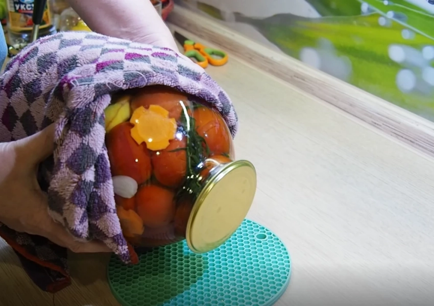 Кроме того, это считается дополнительной стерилизацией: горячий салат, джем или компот сначала покрывает дно банки, а после переворачивания — всю остальную поверхность. Затем банки укутывают, дают им остыть в течение 3–4 дней, после чего их переворачивают обратно и убирают на хранение.