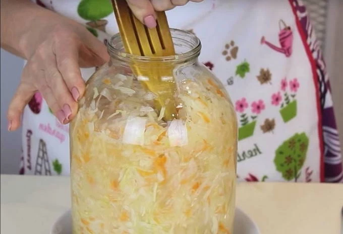 Ежедневно протыкайте капусту деревянной палочкой до дна, чтобы выходили газы.