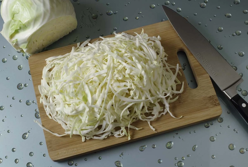 Снимите верхние листья с кочана и нашинкуйте капусту максимально тонко. Такая нарезка — залог будущего хруста.