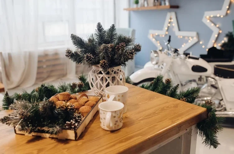 Пусть даже будни станут праздничными. Небольшая ёлочка, пуансеттия в горшке, открытки с пожеланиями на доске вдохновят и поднимут настроение. Можно составить список желаний или целей на будущий год — пусть висит рядом и напоминает о мечтах.