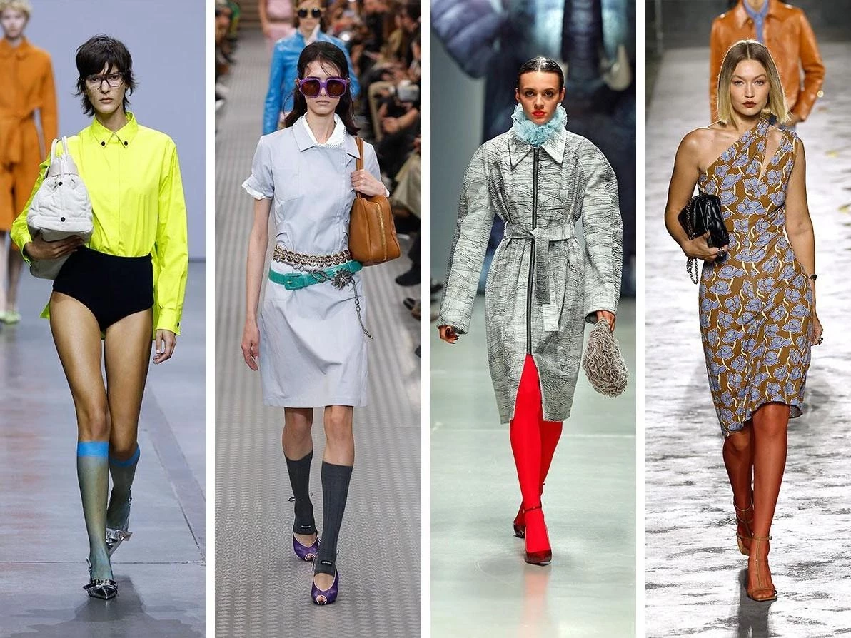 Яркие оттенки, такие как оранжевый, зеленый и фиолетовый, станут акцентными деталями весенне-летнего гардероба. Дополнить образ можно цветными носками и гетрами, создавая игривый и смелый стиль. Особенно эффектно этот тренд смотрится с однотонными нарядами, позволяя выделить отдельные элементы образа.