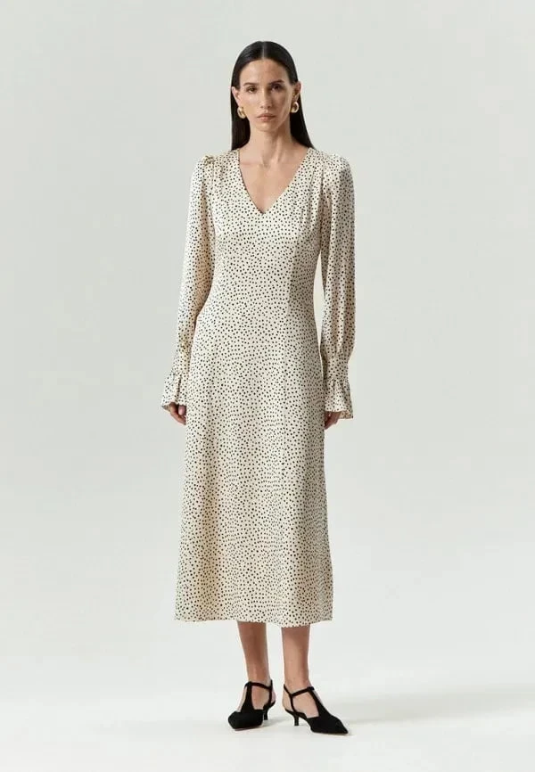 Шелк или атлас с горошком — это идеальное сочетание женственности и элегантности. Мелкий горошек выглядит утонченно и подходит для офиса. Фасон должен слегка облегать фигуру, но не быть слишком тесным. Рукава три четверти или длинные с манжетами добавят изящества, а небольшой разрез сбоку — нотку современности.