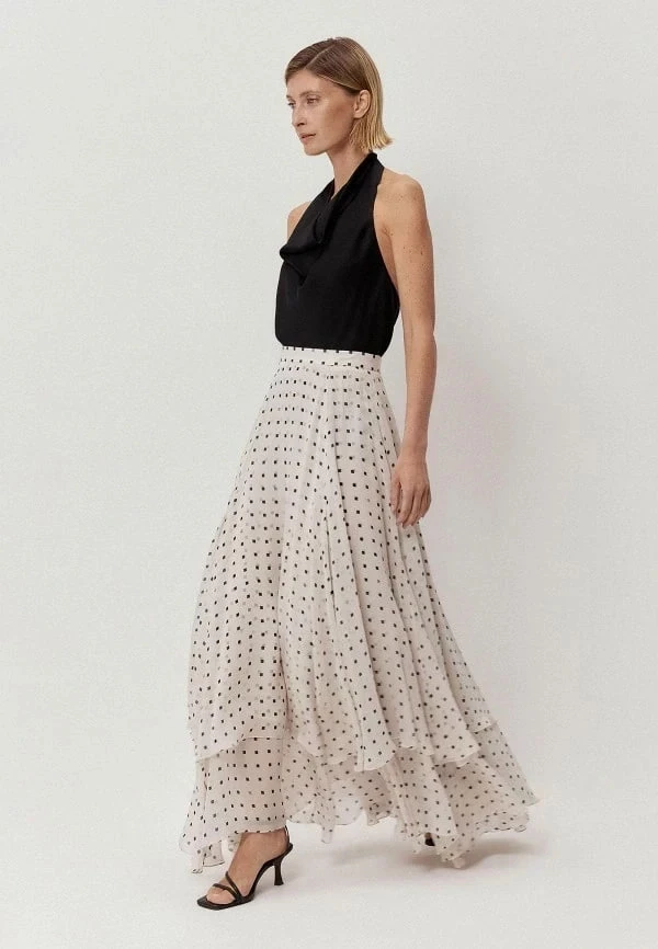 Юбки из шифона, органзы или тонкого хлопка с горошком — настоящая легкость и свобода в движении. Универсальная длина — миди чуть ниже колена.