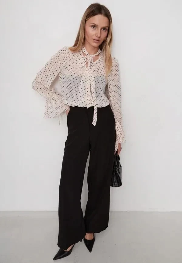 Блуза с горошком и бантом — квинтэссенция женственности и стиля. Для вечера подойдут модели из шелка или атласа с объемными рукавами-фонариками или драпировкой, которые создают эффектный силуэт.
