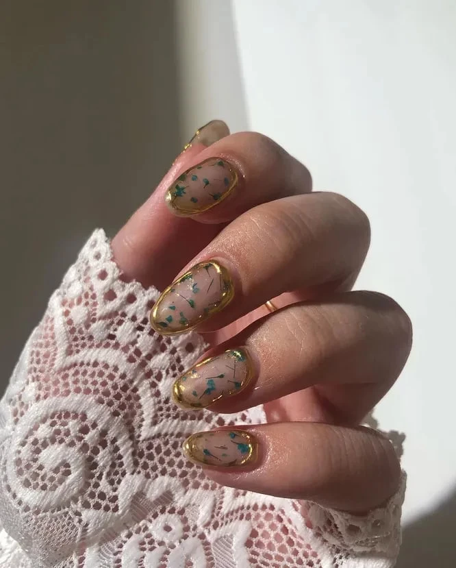 Маникюр с эффектом драгоценной огранки, популярный с зимы, летом заиграл новыми красками. Золотистый контур великолепно сочетается с цветочными мотивами, сухоцветами и нежными пастельными оттенками. Такой дизайн выполняется с помощью шиммерного лака, объемного геля или зеркальной втирки, создающей эффект ювелирной оправы. Этот маникюр — настоящее украшение для ногтей, при этом выглядит легко и ненавязчиво.