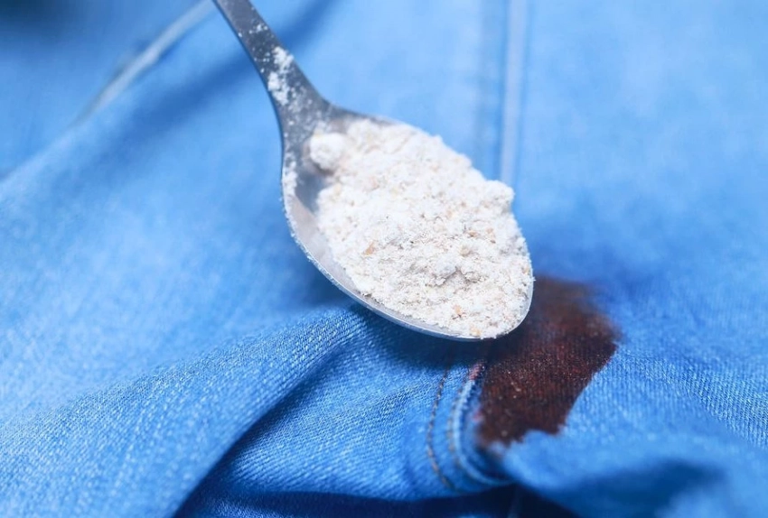 • Присыпьте пятно крахмалом, содой или детской присыпкой – они впитают часть жира. Оставьте на 15–20 минут, затем стряхните.