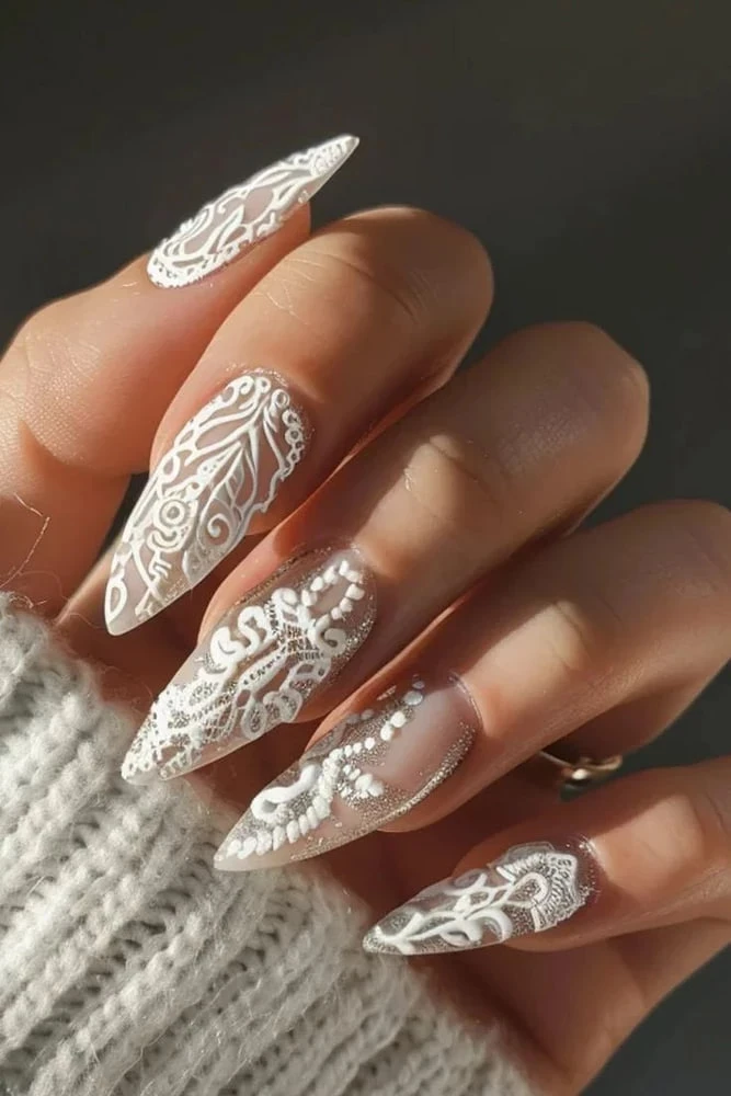 Кружево на ногтях — это женственно, элегантно и тонко. Тонкие завитки, прорисованные вручную, создают эффект настоящего кружева. А еще это может быть не только белый, но и яркий контрастный узор.