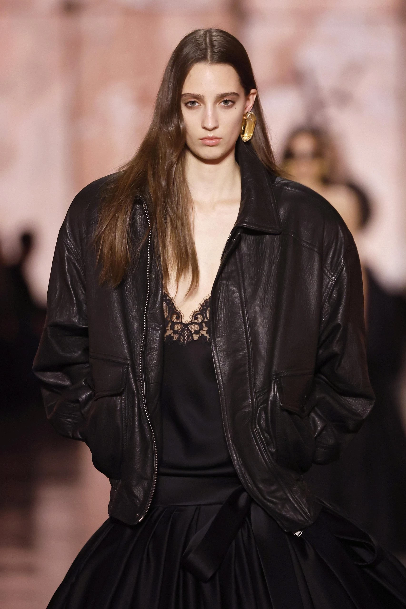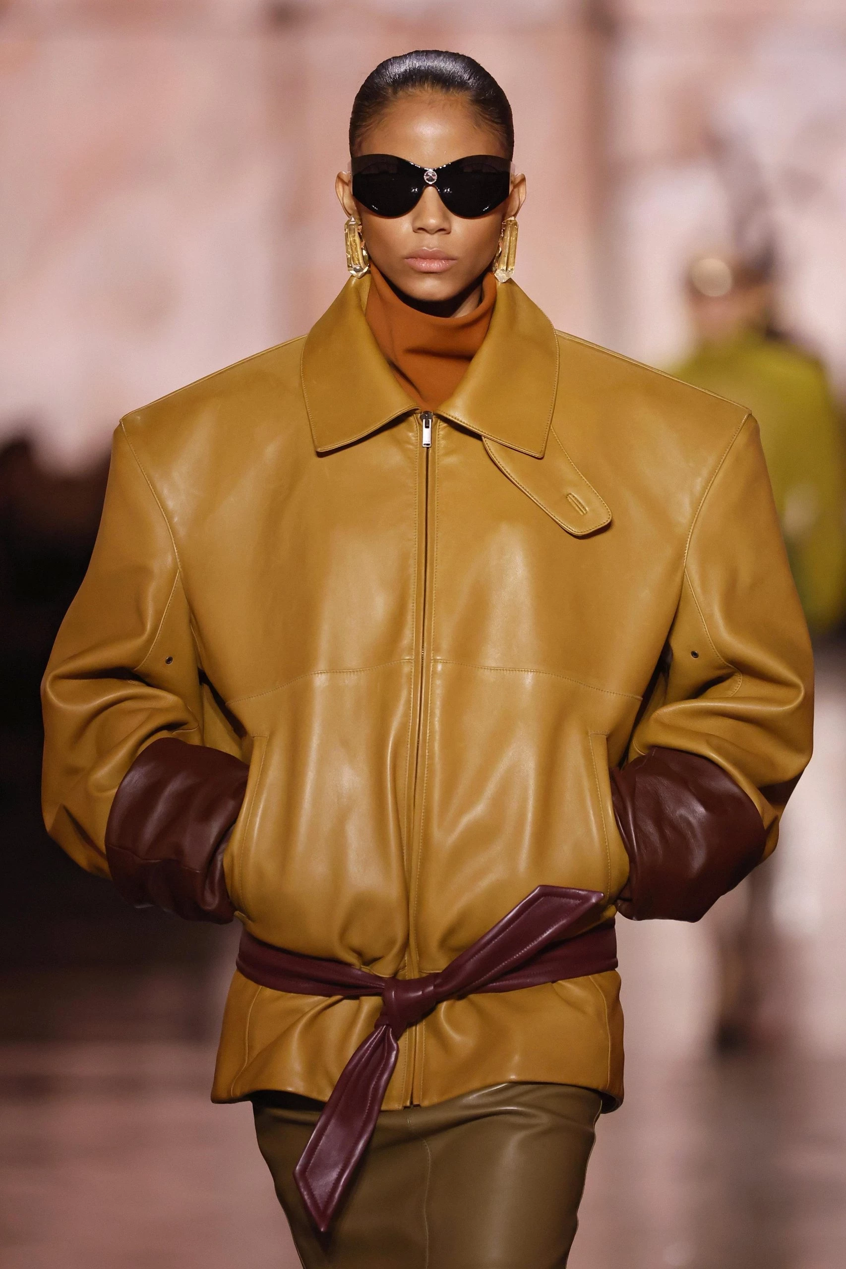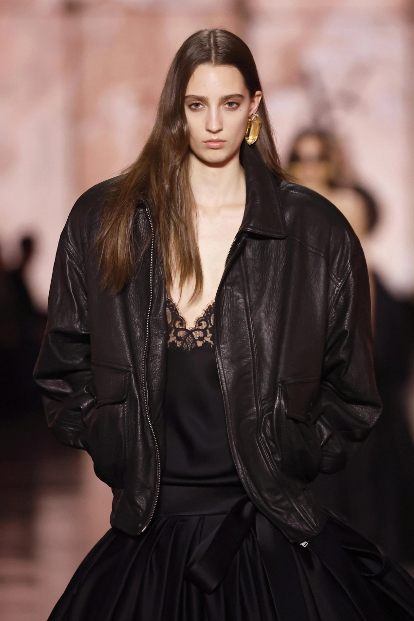 Объёмные кожаные бомберы и «мужские» куртки снова в моде, но теперь с характерным налётом винтажа. Кожа становится главным акцентом — грубая, плотная, с выраженной текстурой. Хит сезона — расстегивать такие куртки снизу, создавая модный разрез и добавляя образу лёгкости. Такой приём также применяется к пальто и рубашкам и стал настоящим fashion-трюком.