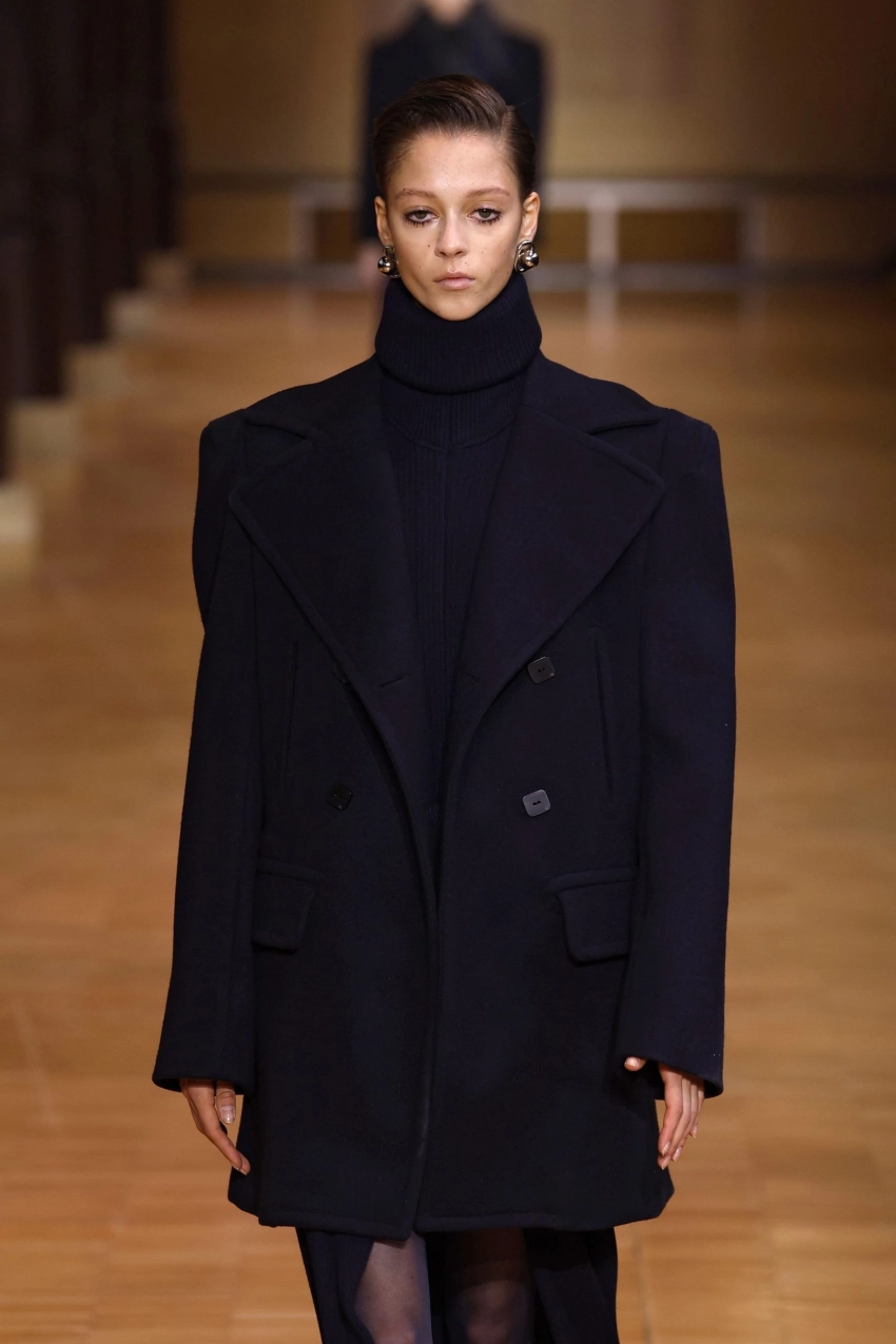 Заниженная талия выходит за рамки привычных юбок и брюк и уверенно заявляет о себе в верхней одежде. Куртки и пальто со смещенной линией талии создают выразительный силуэт: широкий верх и зауженный низ визуально вытягивают фигуру и позволяют играть с контрастами. Их можно сочетать как с мини-юбками и шортами, так и с пышными юбками. Особенно актуальны модели с чёткими плечами — от Victoria Beckham до Saint Laurent.