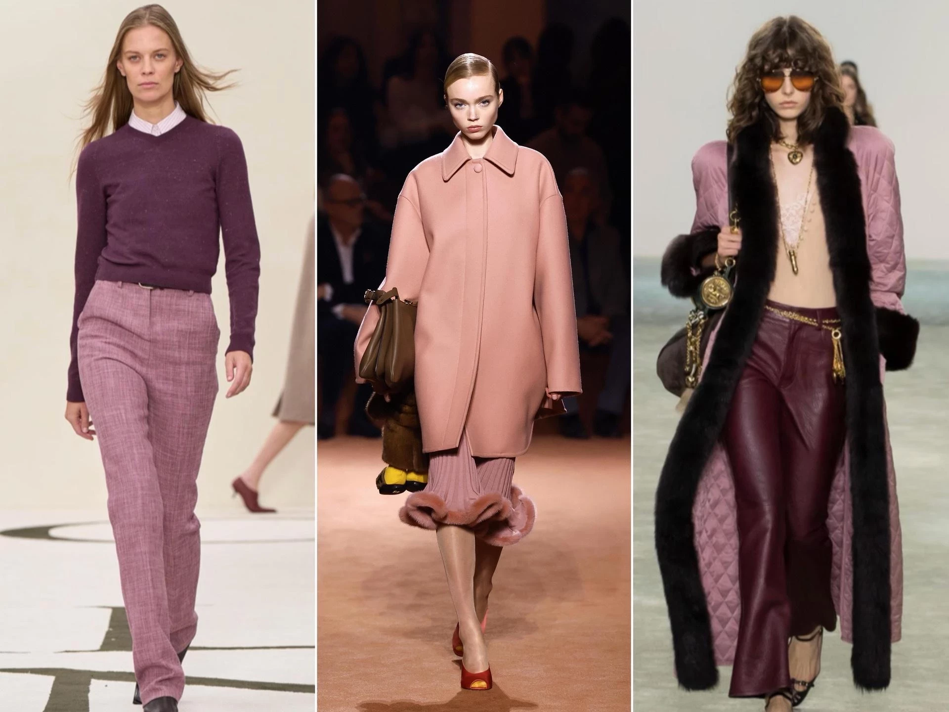 Модный Дом Fendi предлагает не бояться цвета и носить йогуртово-розовый с головы до ног — пальто, сапоги, сумка, платье. Такой образ выглядит свежо, дерзко и абсолютно по-осеннему, если дополнить его объемными тканями: кашемиром, замшей, зернистой кожей. А для тех, кто не готов к полному розовому погружению, Fendi рекомендует ввести цвет в образ аккуратными акцентами — например, надев светло-розовый верх к темно-коричневым брюкам. Эта пара создает сбалансированный и изысканный контраст.