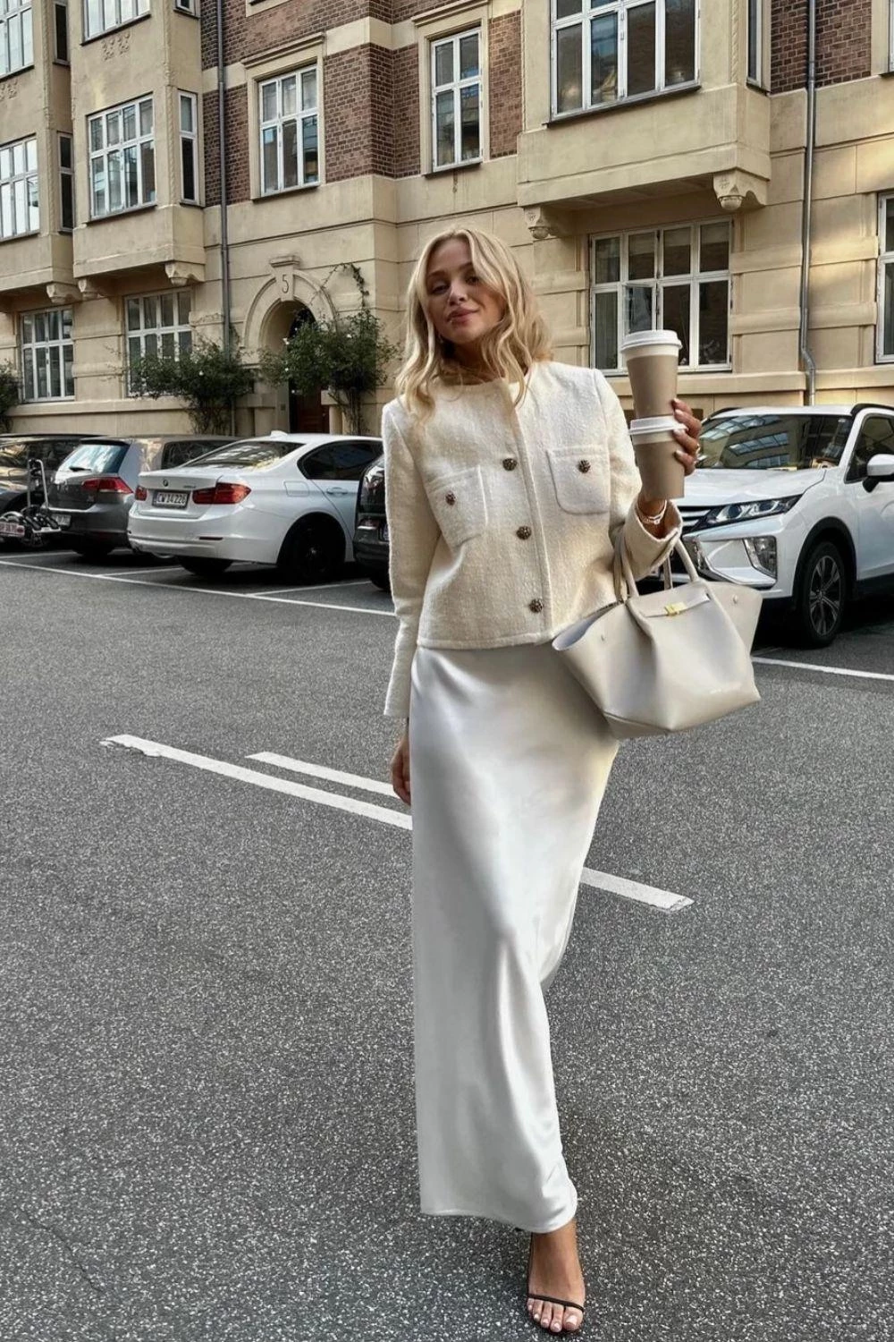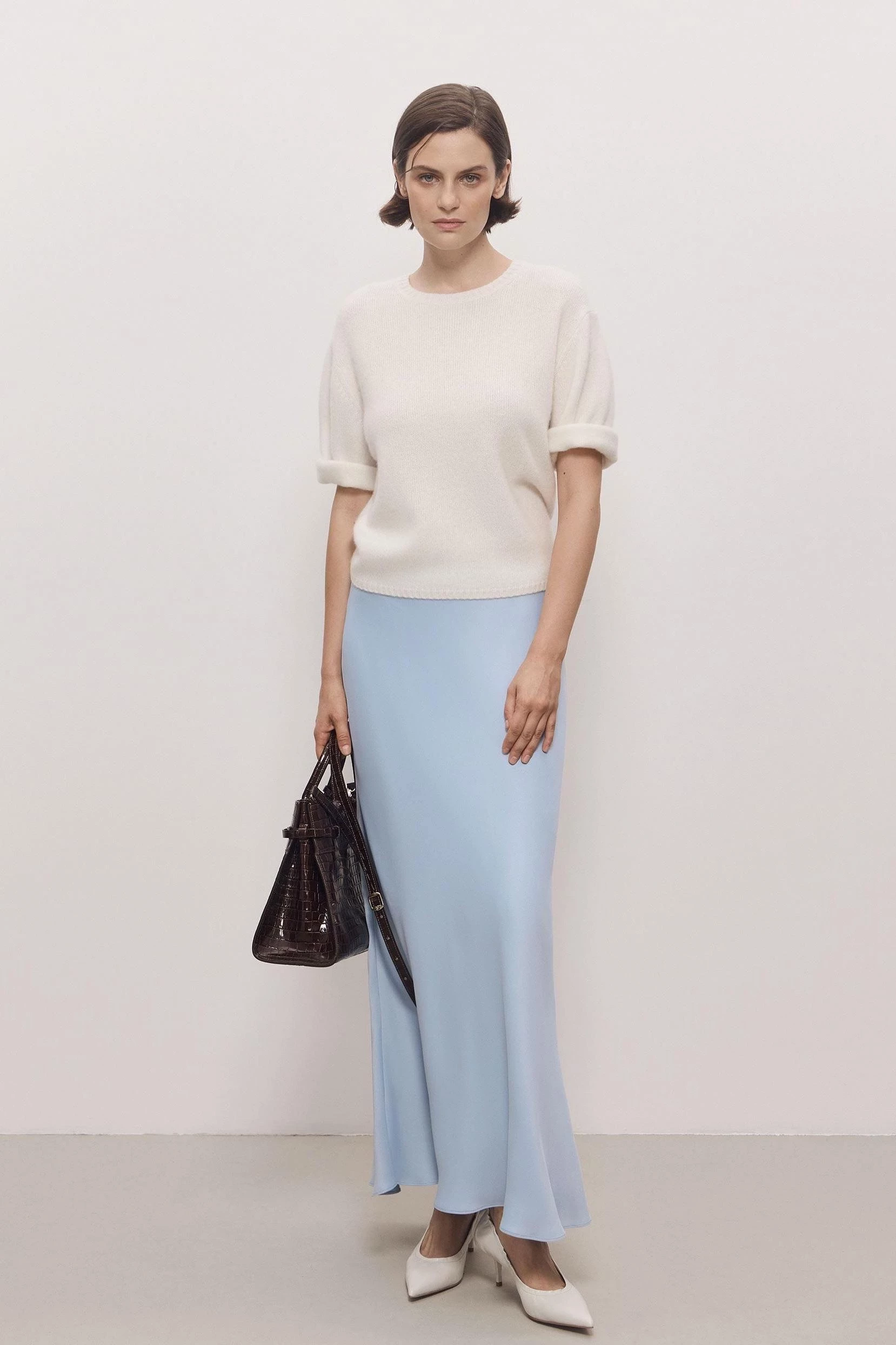 2. Со свитером. Атлас + кашемир или шерсть = идеальный тандем разных фактур. Попробуйте монохром или поиграйте с контрастом оттенков. В завершение — пальто-кокон и модная slouchy bag.