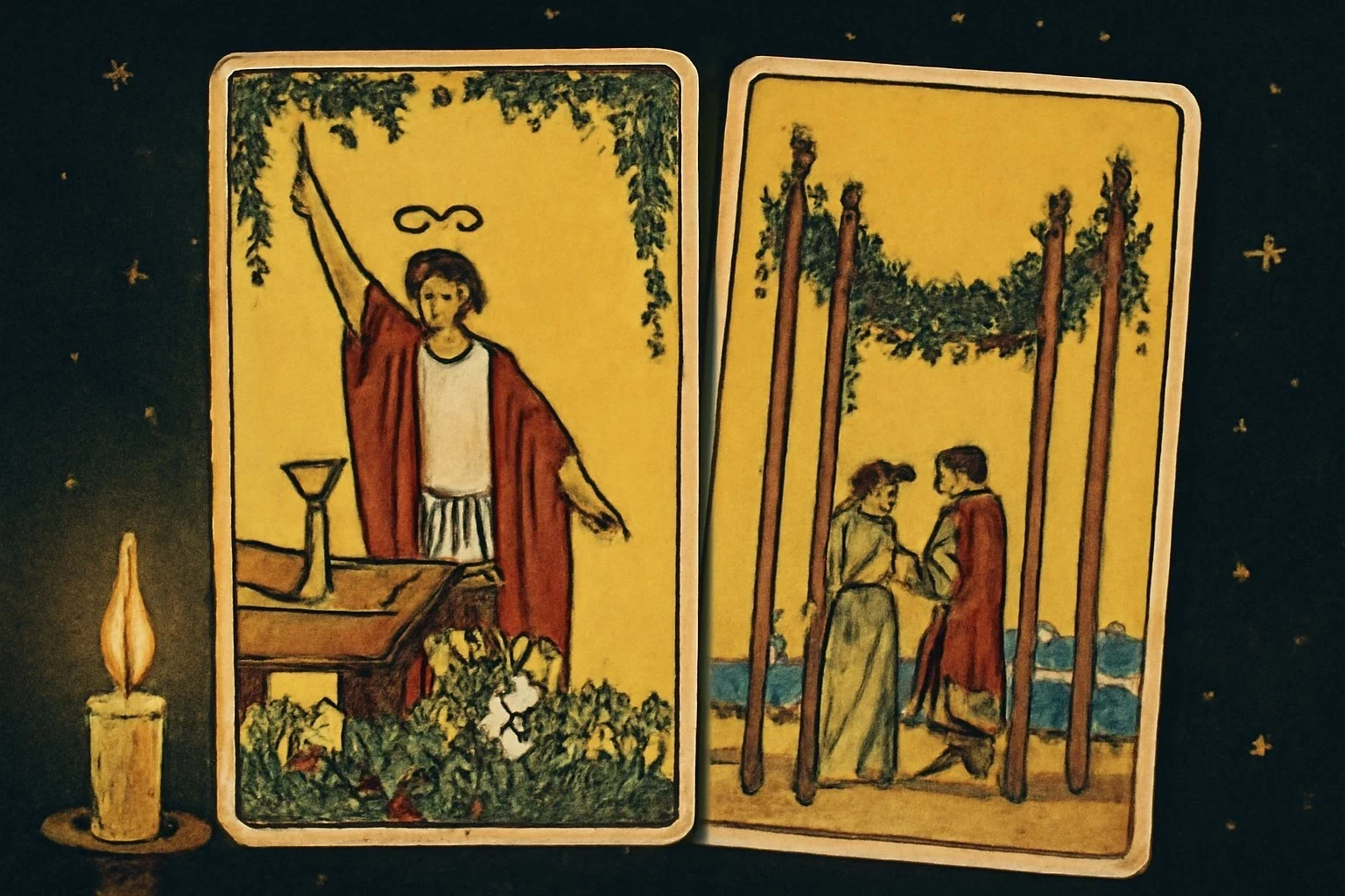 Четвёрка Жезлов в раскладе — это знак выравнивания и завершения одного важного этапа. Наладится то, что долго казалось нестабильным, а результаты прошлых усилий начнут проявляться в реальности. Карта указывает на период вознаграждения, спокойствия и внутреннего равновесия.