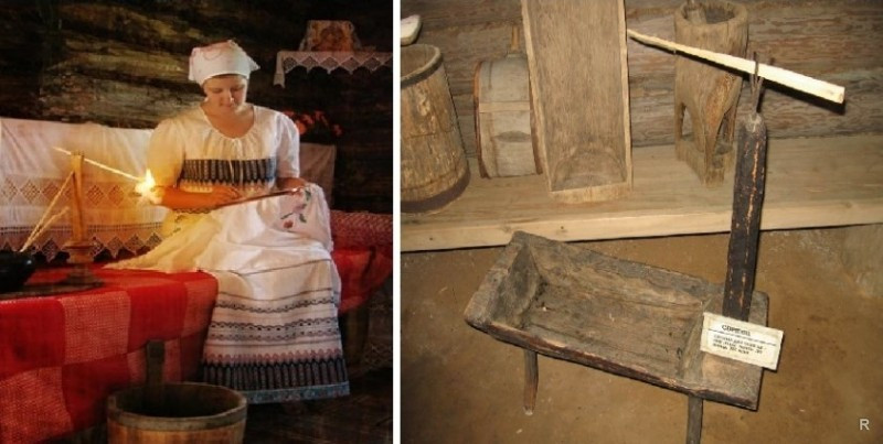На вид этот инструмент напоминал вилку, а в центре крепилась горящая лучина. Благодаря этому, её можно было легко перемещать с места на место. Внизу находился обруч, который усиливал конструкцию, а всё это помещали в ведро с водой, чтобы предотвратить случайные возгорания.