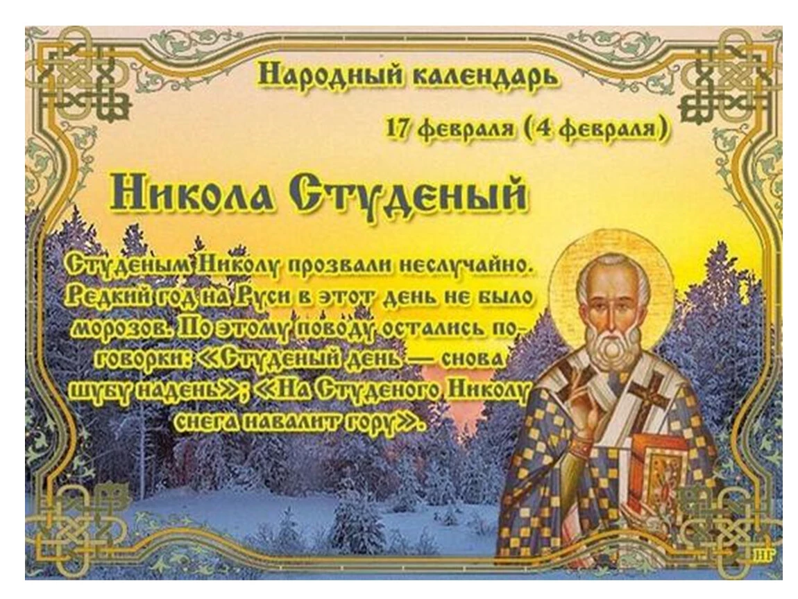 17 февраля в церквях вспоминают преподобного Николая Исповедника, а в народе празднуют Николу Студеного. Этот день всегда был связан с крепкими морозами и снегопадами, и хотя зимняя стужа приносила немало неудобств, в народе верили, что после Николы наступит долгожданное потепление.