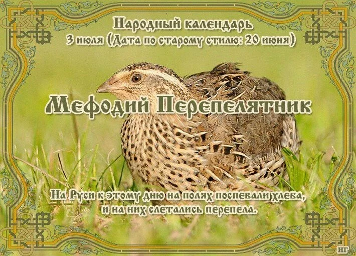 В народе этот день получил название Мефодия Перепелятника. Июль — время, когда на полях начинает наливаться хлеб, а перепела слетаются в поисках зерна. Именно тогда охотники выходили на легкую добычу — птиц можно было ловить без особого труда, и никто не оставался без трофея. Так за святым закрепилось прозвище «перепелятник».