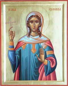 Святая Евфимия родилась в благочестивой христианской семье и с раннего возраста отличалась твёрдой верой и благонравием. Во времена жестоких гонений на христиан при императоре Диоклетиане её вместе с другими верующими бросили в темницу за отказ участвовать в языческих обрядах.