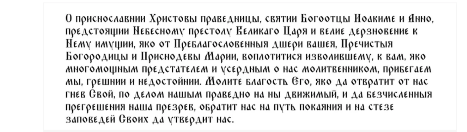 «О, святии праведницы, Богоотцы Иоакиме и Анно! Молите Милосердаго Господа, яко да отвратит от нас гнев Свой, по делом нашим праведно на ны движимый, и да беcчисленные прегрешения наша презрев, обратит нас, рабов Божих, на путь покаяния, и на стези заповедей Своих да утвердит нас.